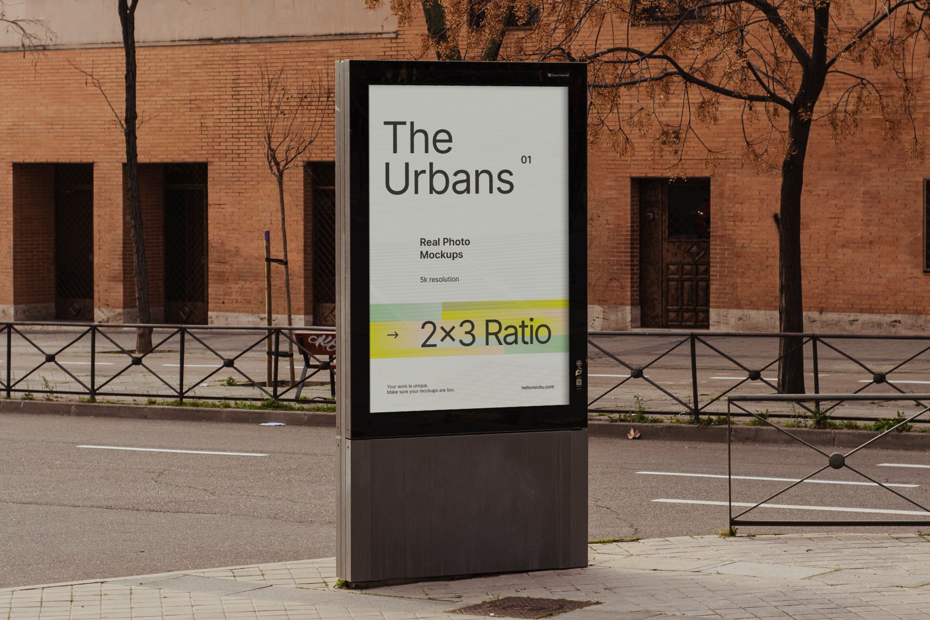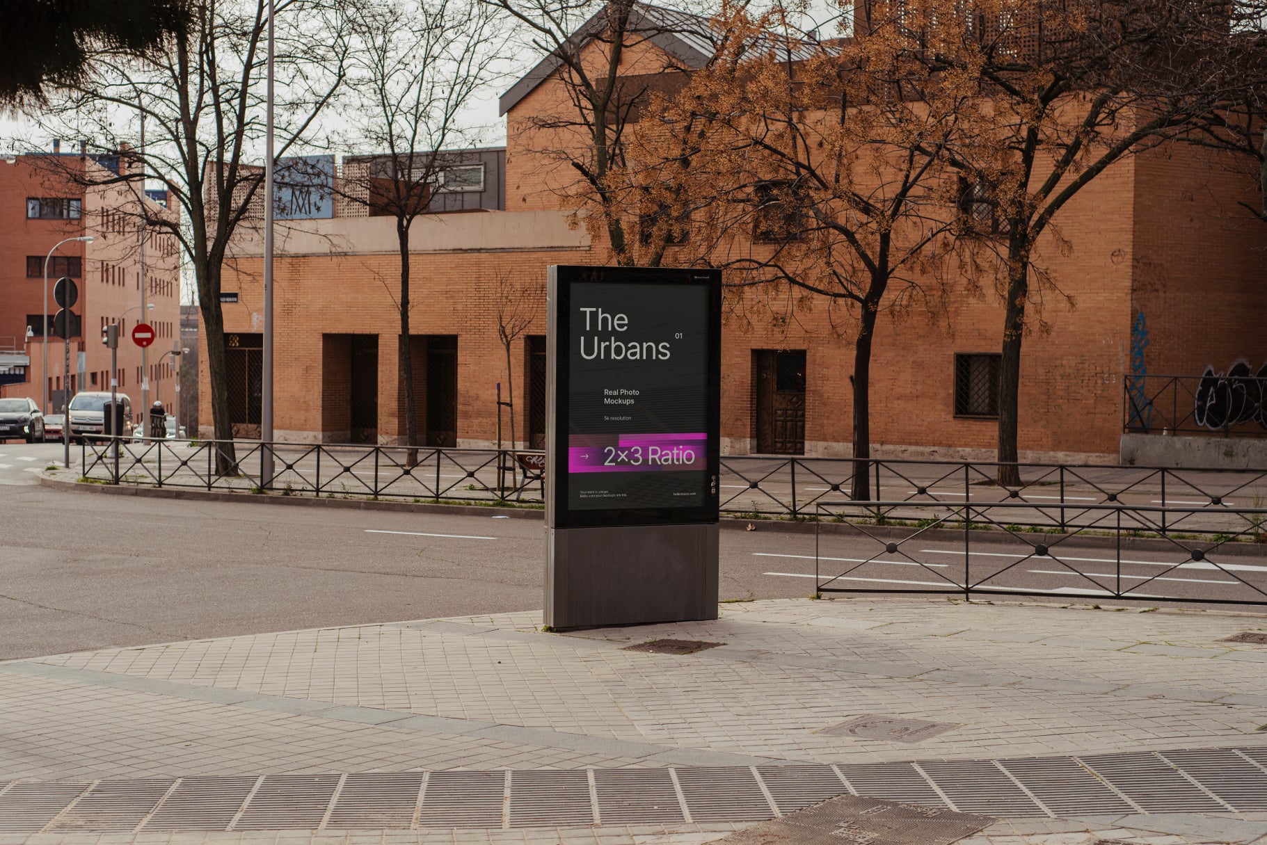 Photographed mockup of a 2x3 street billboard, captured on a quiet urban corner. Ideal for presenting posters, campaigns, or branding visuals in a real-world outdoor setting.