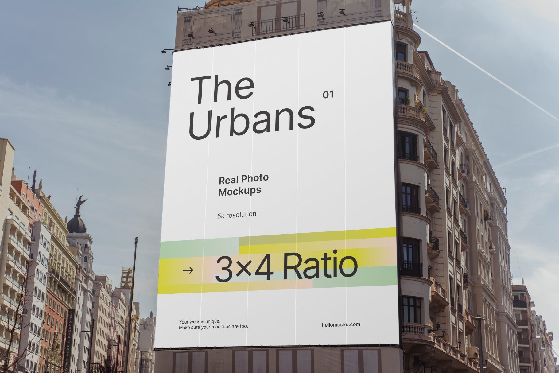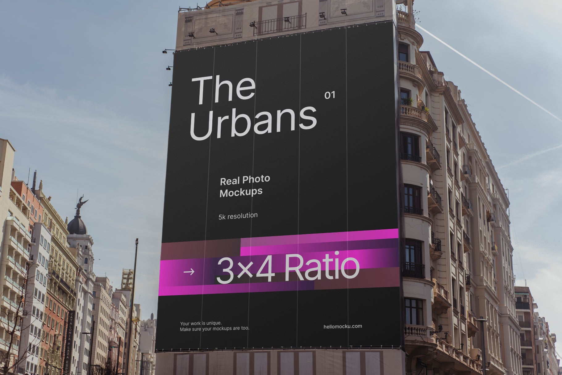 Photographed mockup of a 3x4 large-format banner installed on a building facade. Perfect for showcasing bold campaigns, product launches, or outdoor advertising at scale.