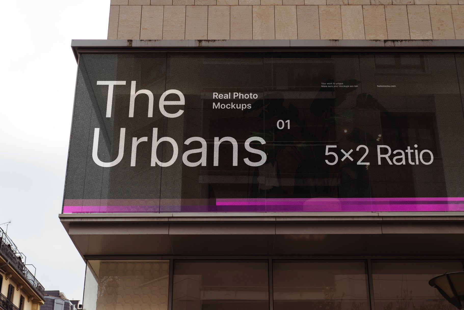 Photographed mockup of a 5x2 window vinyl, printed on microperforated material and applied to a real storefront. Perfect for showcasing branding, promos or campaigns in a clean, city-facing setting.