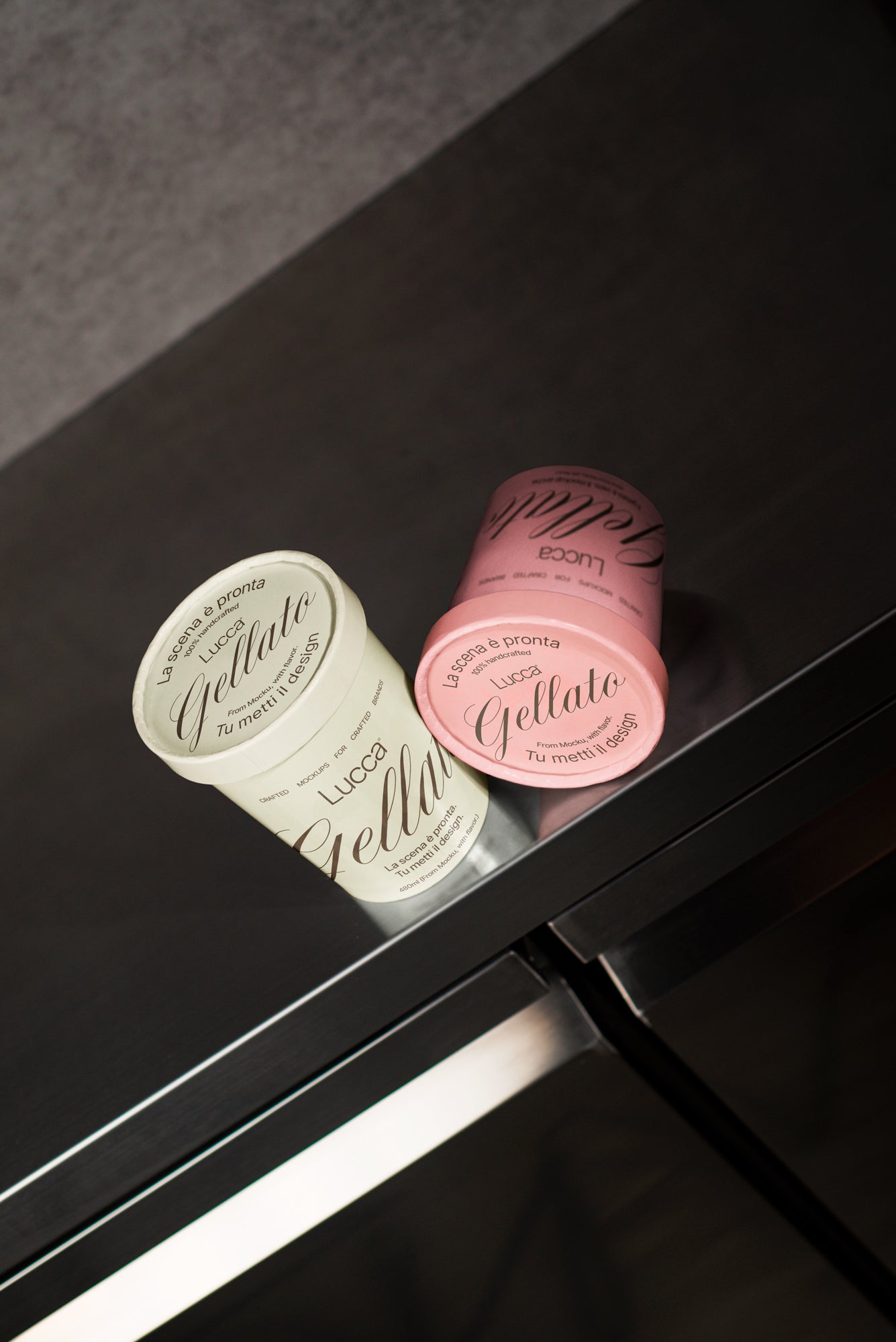 Two gelato tubs are positioned diagonally on a brushed stainless steel surface. The containers rest on their sides, creating a dynamic composition that highlights the contrast between colors and typography. Overhead lighting produces defined shadows and subtle reflections, emphasizing the cylindrical volume of the tubs while maintaining a clean, professional aesthetic.