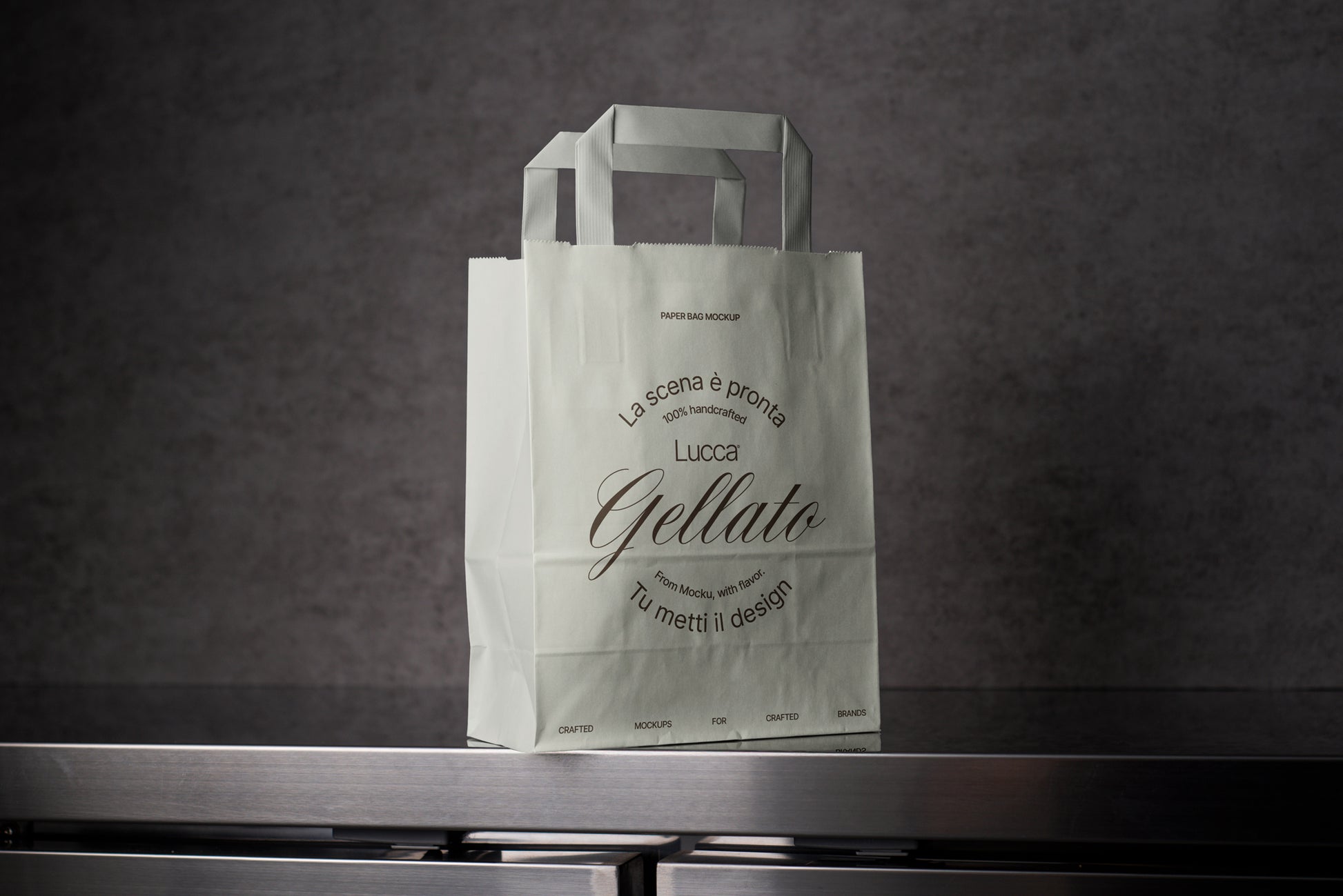 This mockup set presents a paper shopping bag in two perspectives: one laid flat on a textured surface, with soft daylight and subtle shadows enhancing the material, and another upright on a clean, minimal background for a straightforward product showcase. Both views highlight the paper texture, crisp folds, and print-ready surface, making it ideal for branding, packaging, or eco-friendly product design presentations.