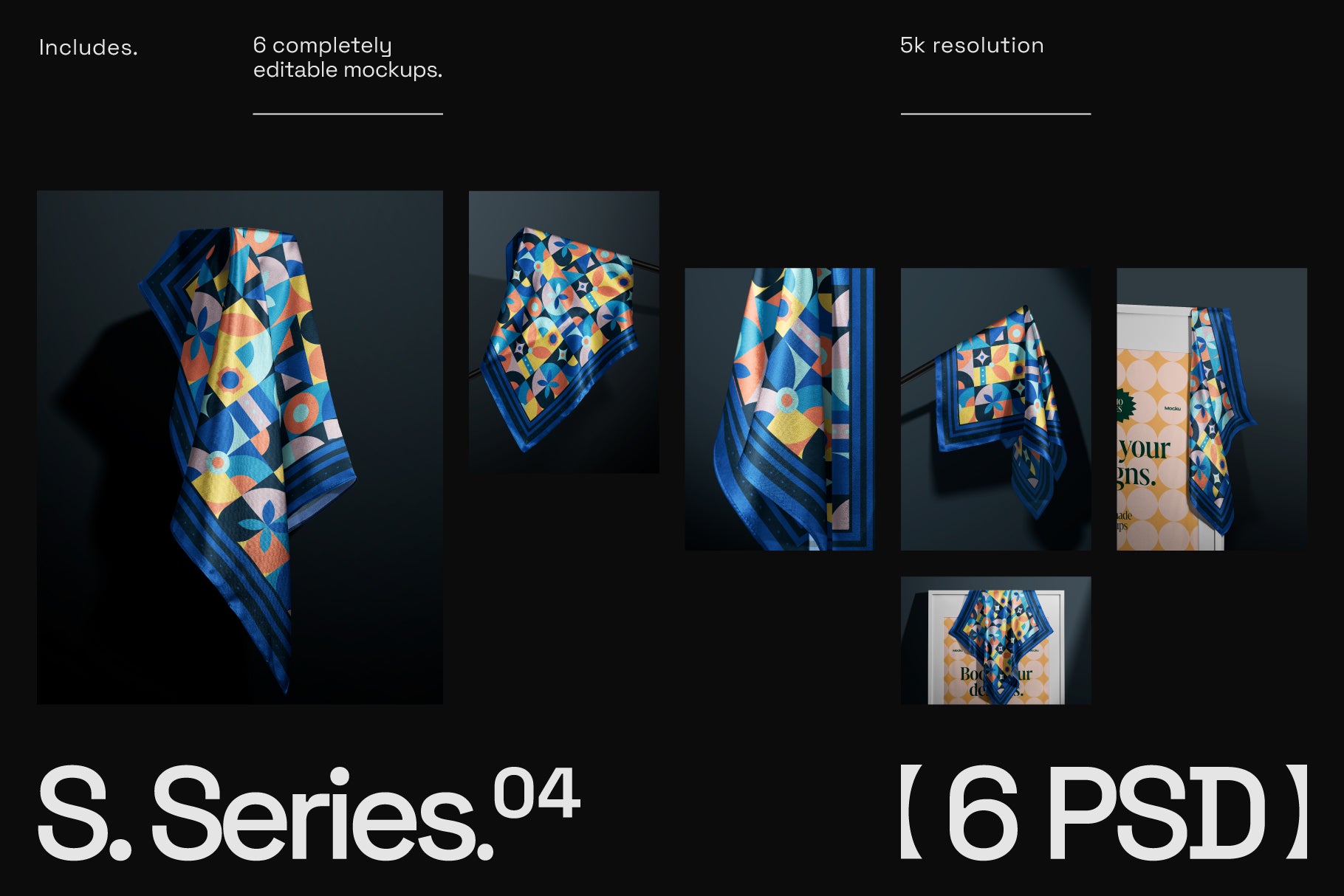 This bundle includes 6 high-resolution PSDs mockups, crafted from real photography for a natural, true-to-life look. Designed to help you showcase your silk scarf designs with ease and realism, these mockups are simple to use and fully editable. Perfect for adding that extra layer of authenticity to your presentations.